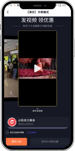 潜客看到商家宣传视频,可在视频中领取优惠券并根据定位到店消费